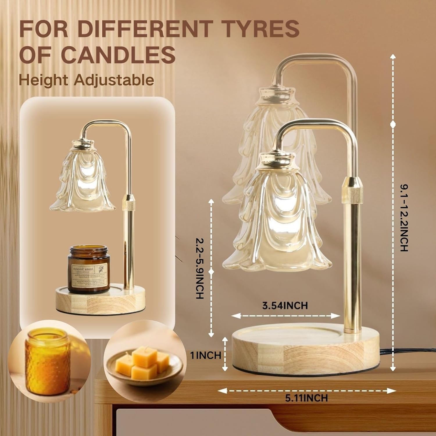 • Height Adjustable & Various Candles Fit: This candle warming lamp features a height-adjustable pole and a 360° swivel top, paired with a 5.5"×5.5" non-slip solid wood base. This fully adjustable system ensures the candle lamps provide a nice fit for various candles, from jar candles to wax melts and blocks.